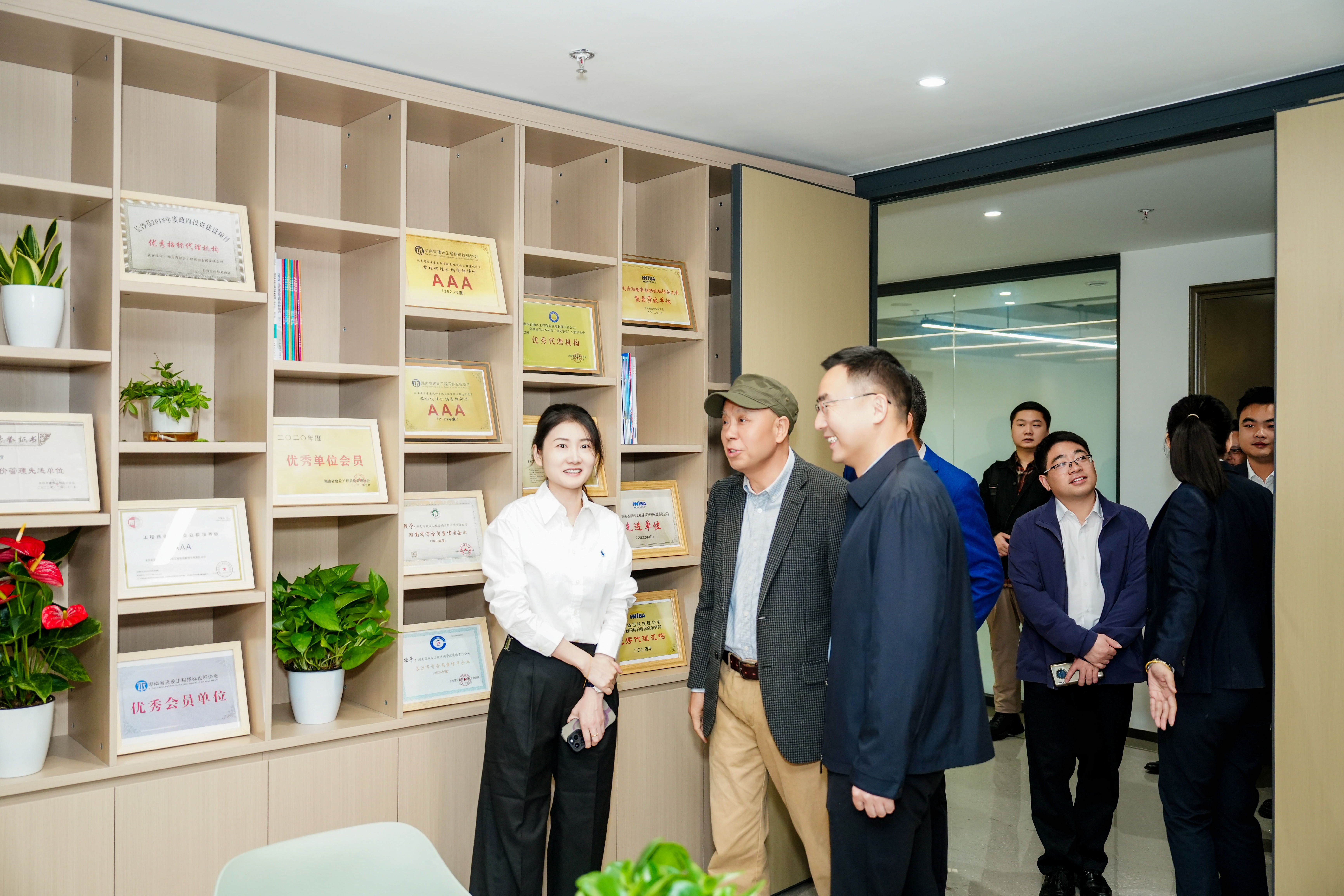 在實(shí)地參觀環(huán)節(jié),與會(huì)嘉賓走訪了湘咨管理公司的開評(píng)標(biāo)室、檔案管理中心及企業(yè)文化展區(qū)。